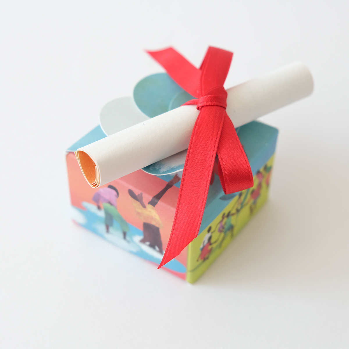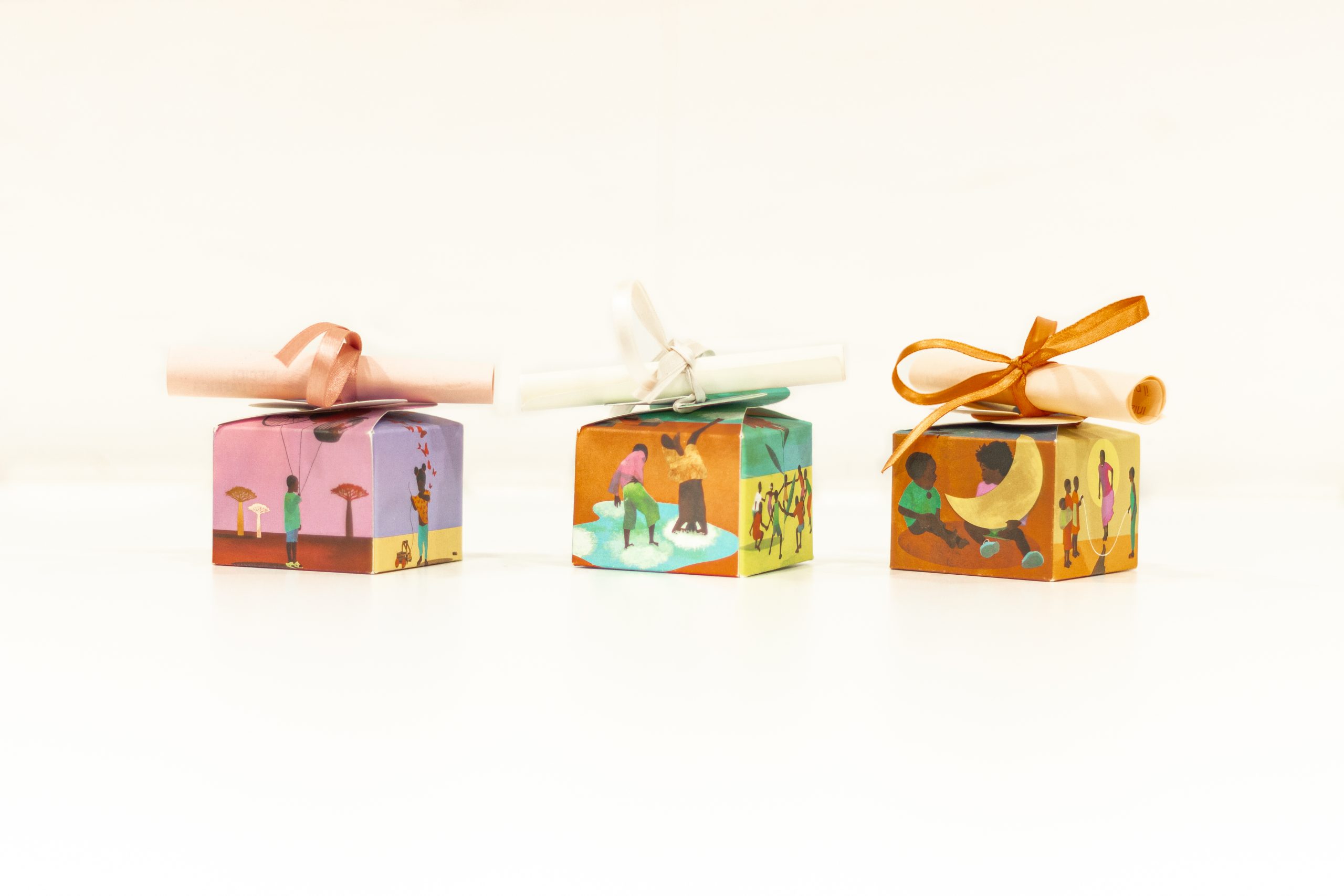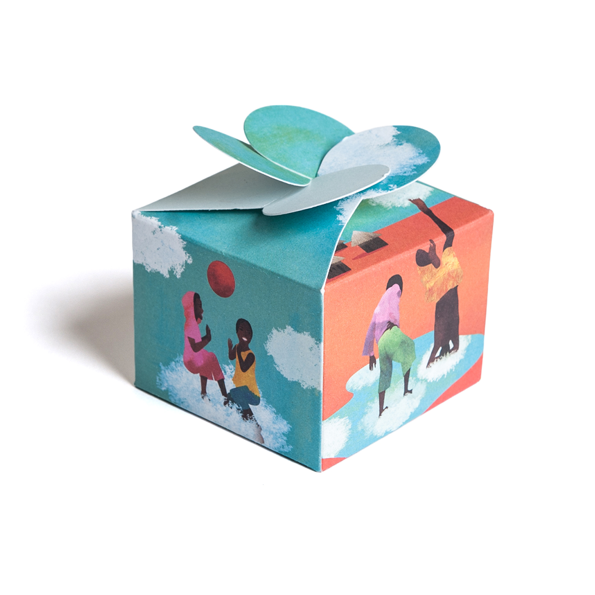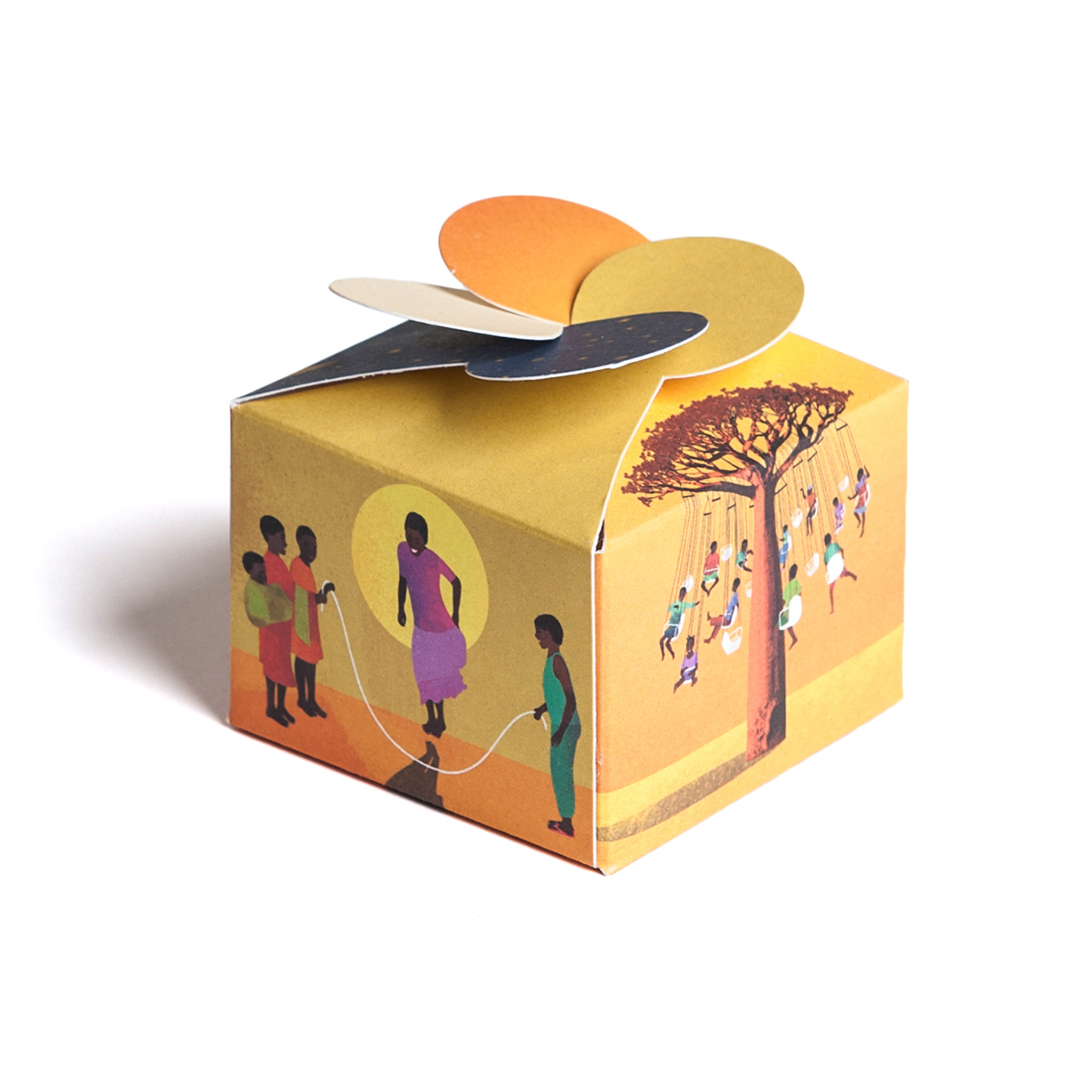 Scatolina stampata a 4/0 colori, quadricromia su carta Oikos 300 gr con illustrazioni di Anna Godeassi.