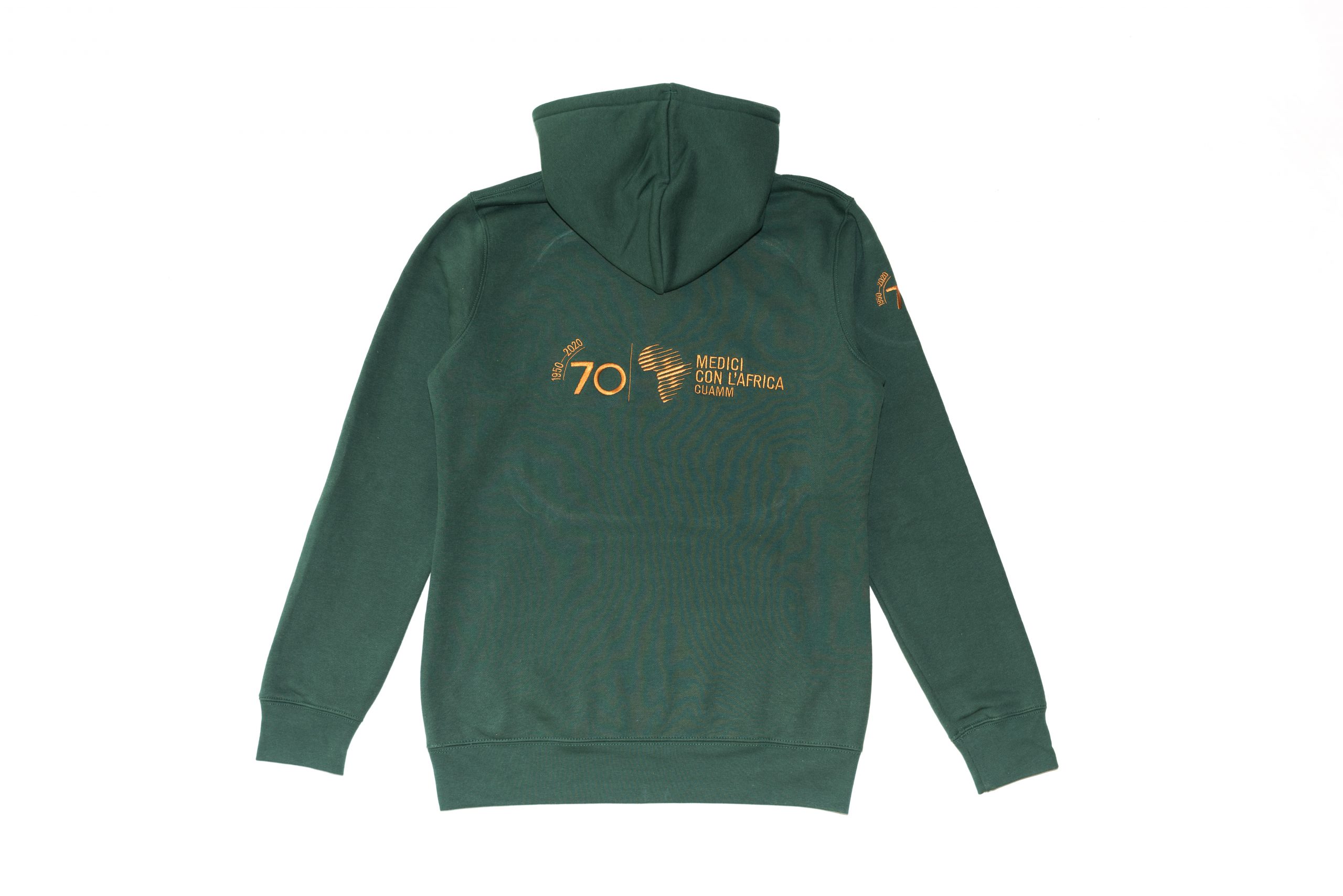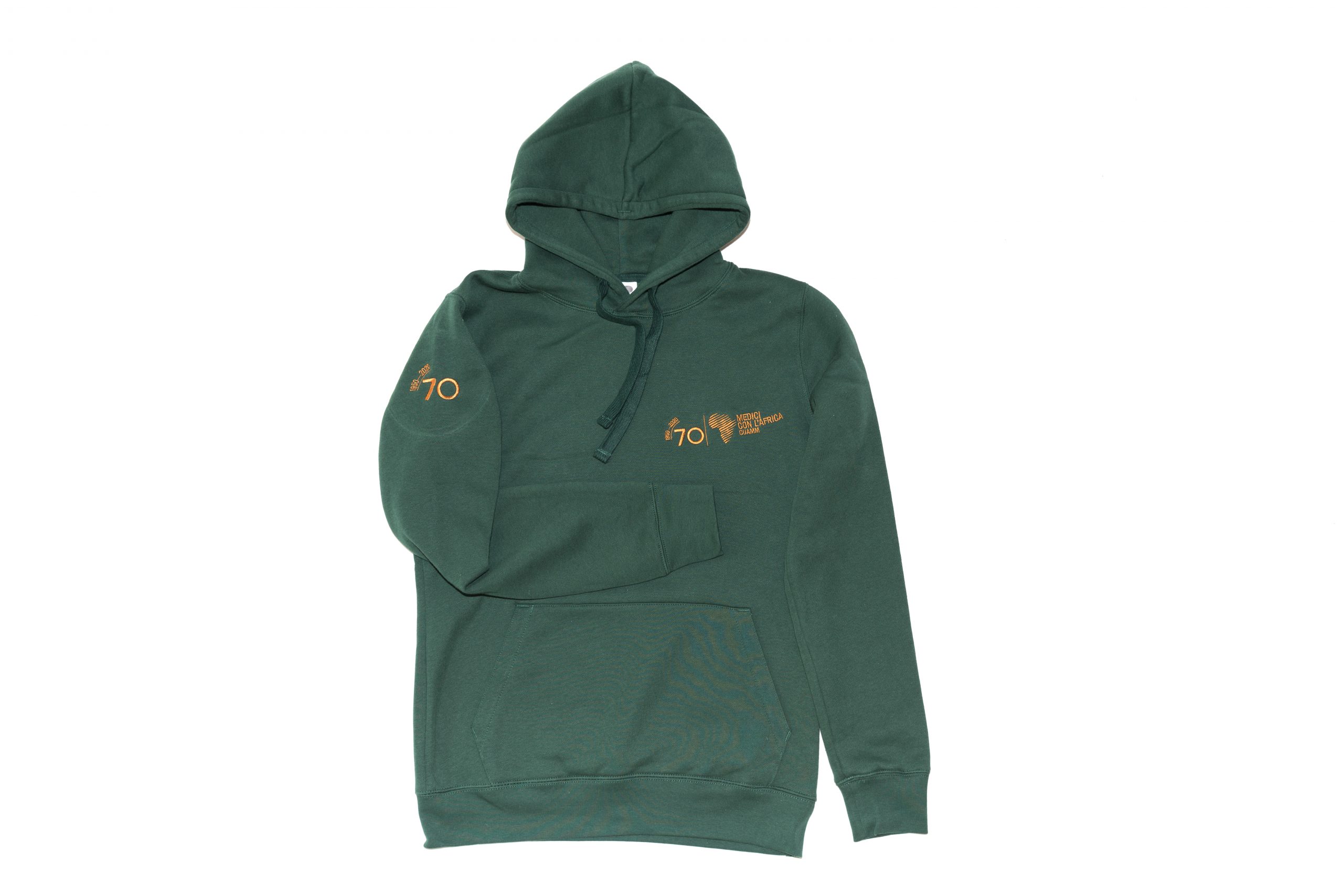 Felpa colore verde bottiglia con cappuccio e tasca, senza zip. Logo Cuamm 70 anni ricamato sul fronte, spalla e retro colore bronzo.