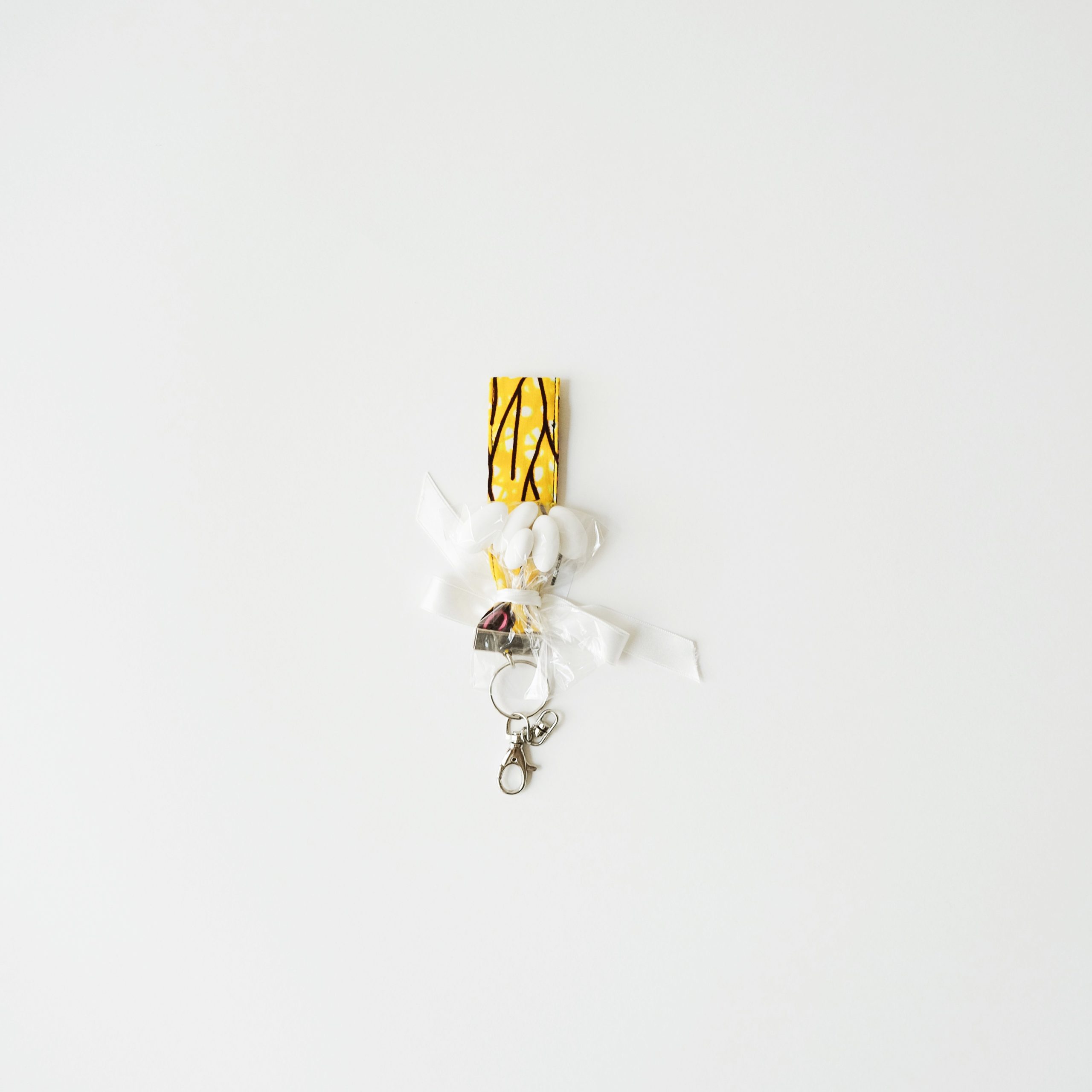 Il portachiavi in tessuto Wax viene fornito confezionato con: confetti, sacchettino trasparente, nastro in raso bianco o rosso e biglietto pieghevole personalizzabile.