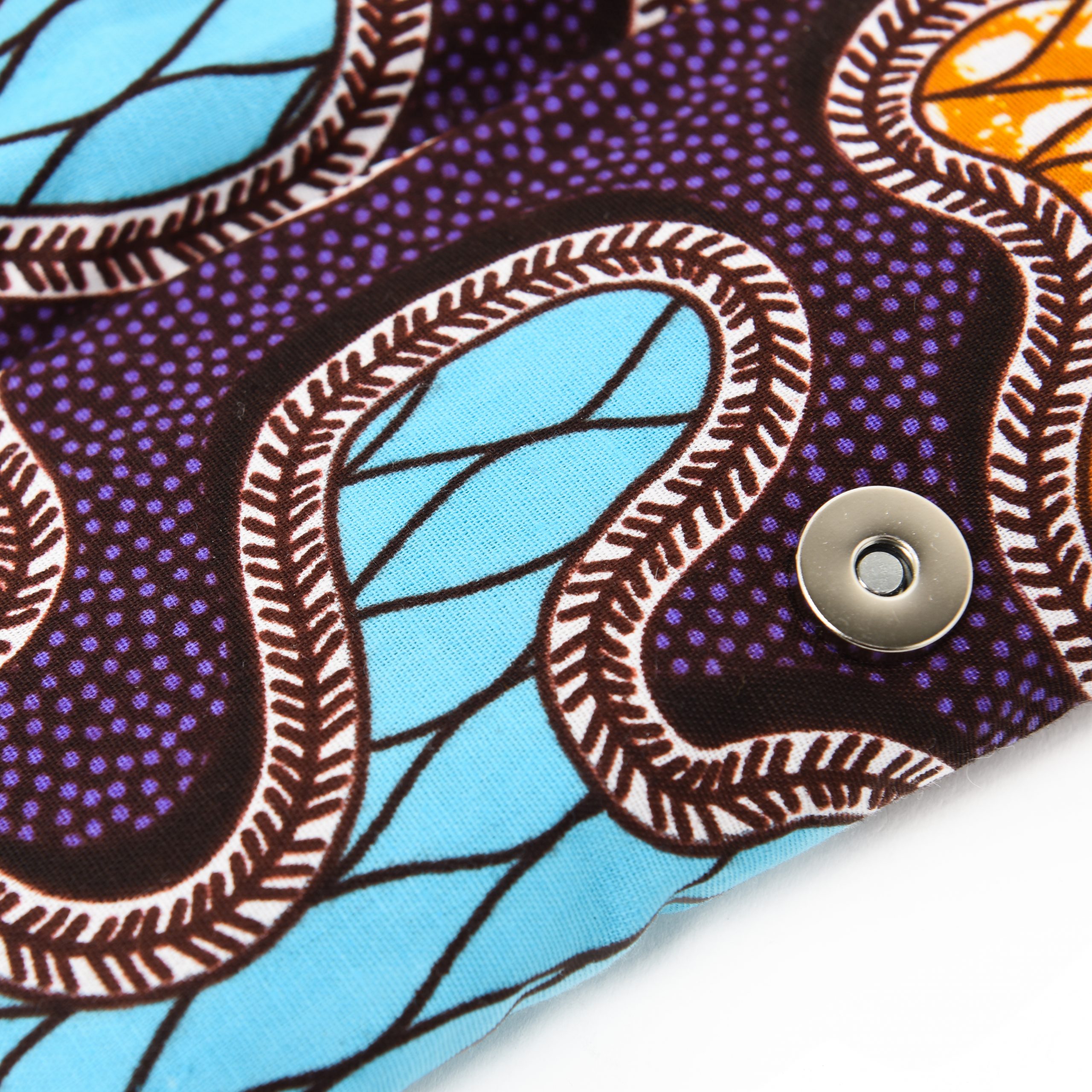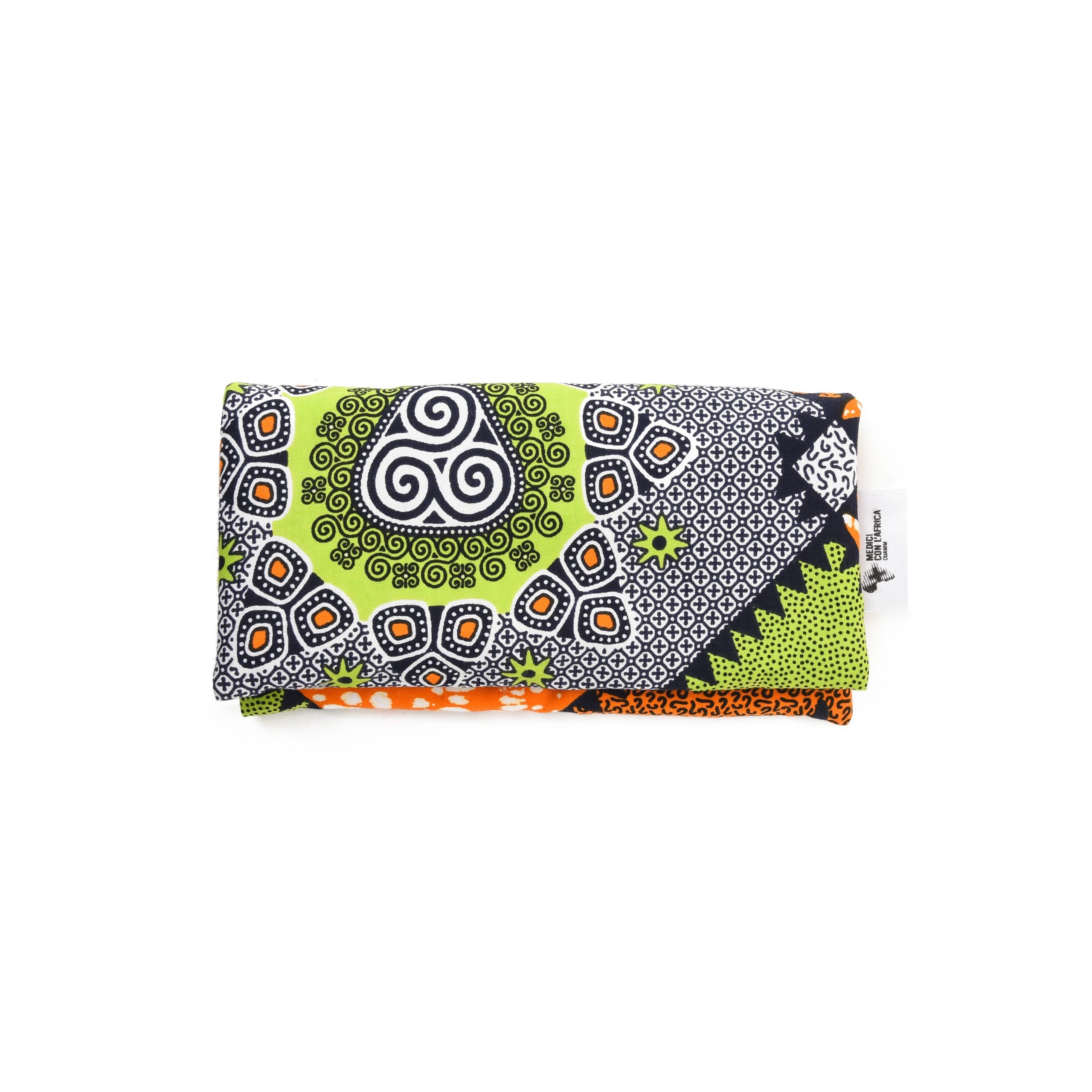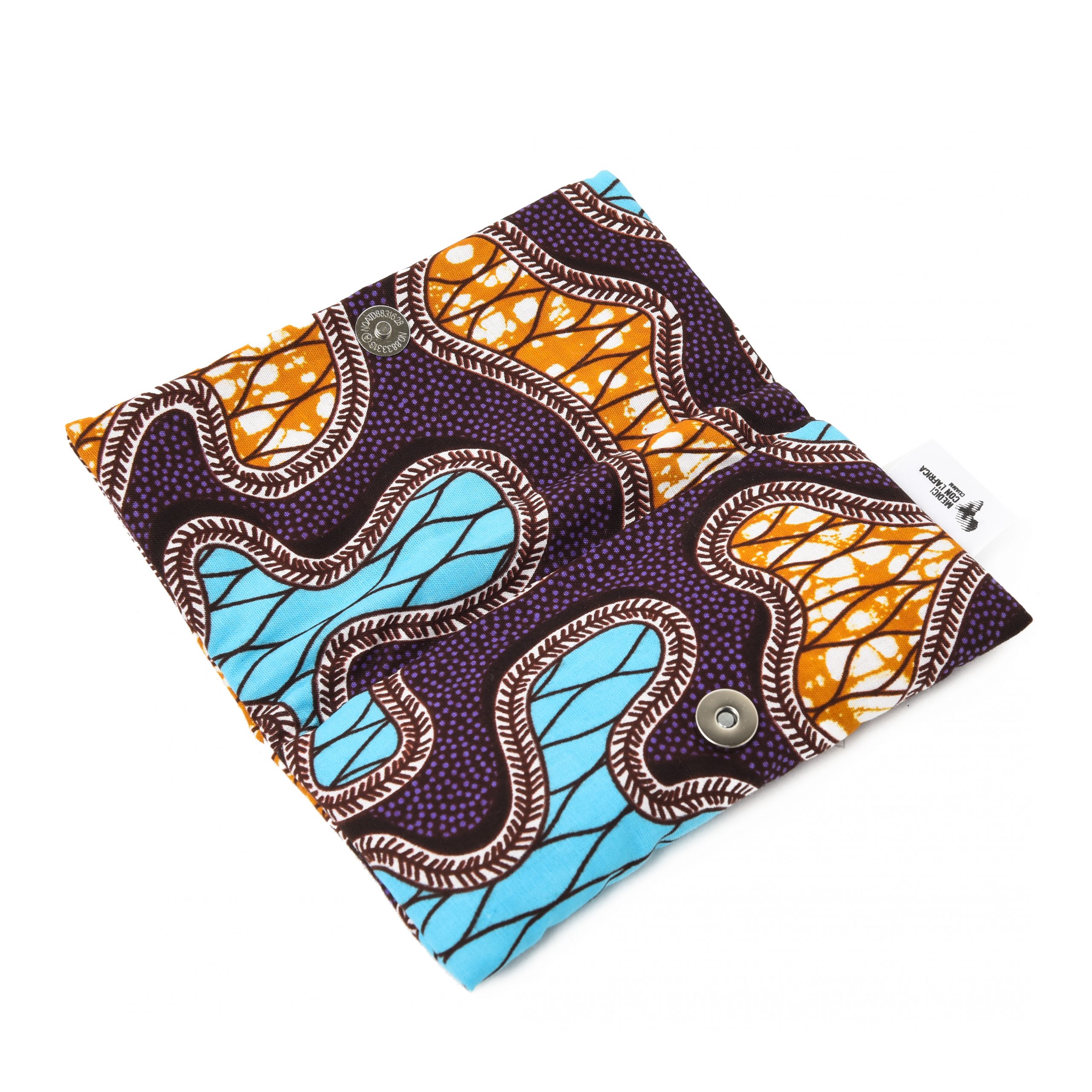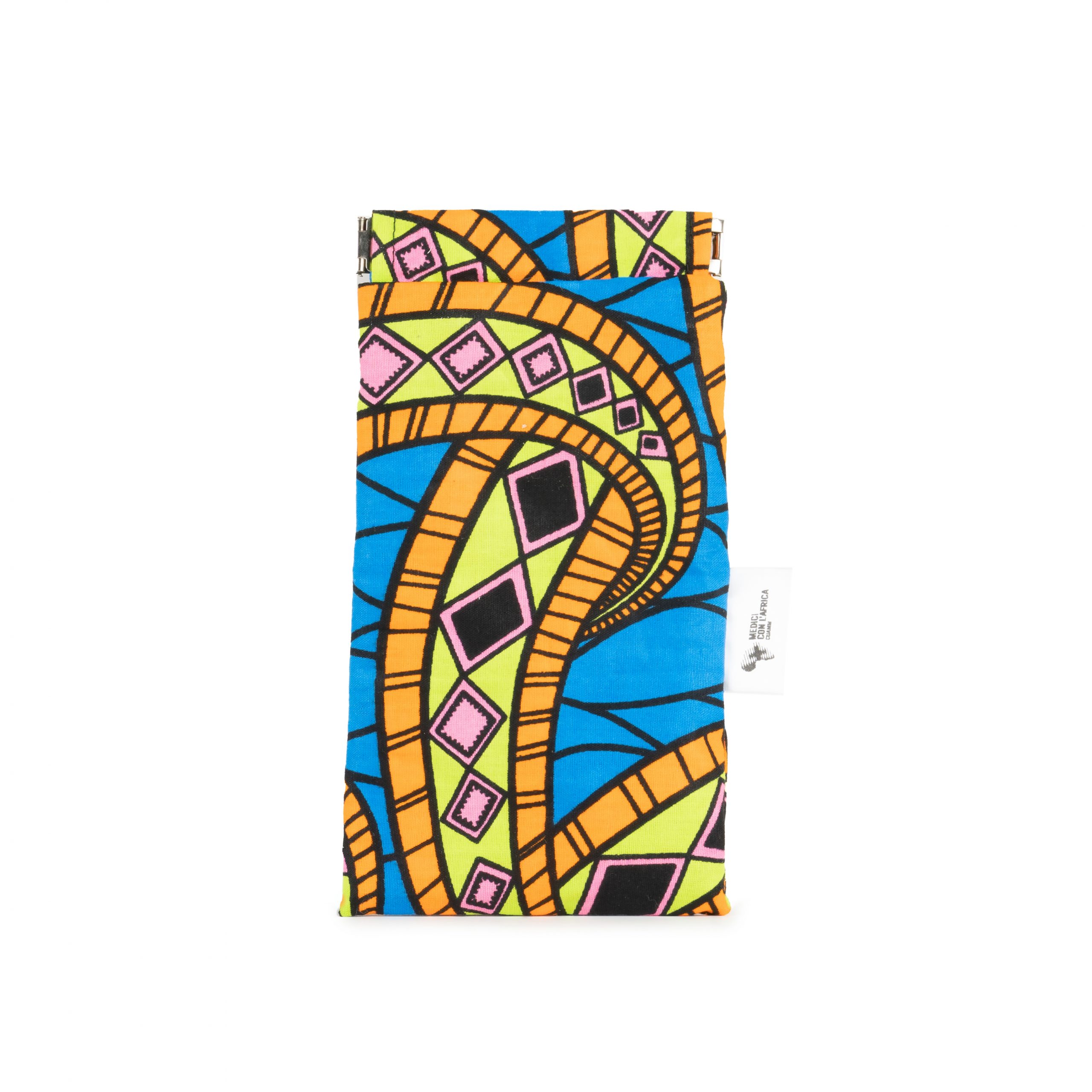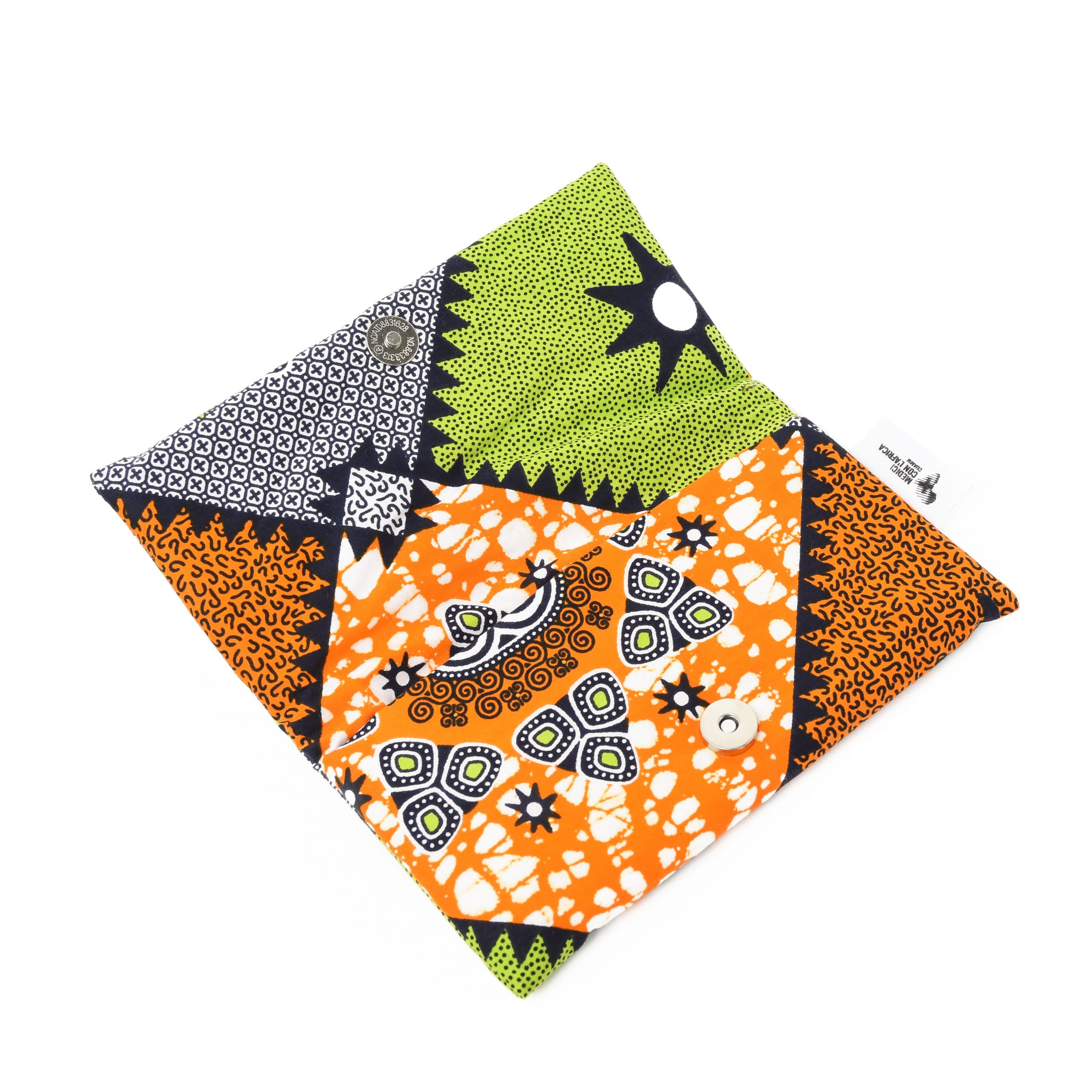Composizione: tessuto africano con imbottitura e chiusura con bottone magnetico o clip metallica.