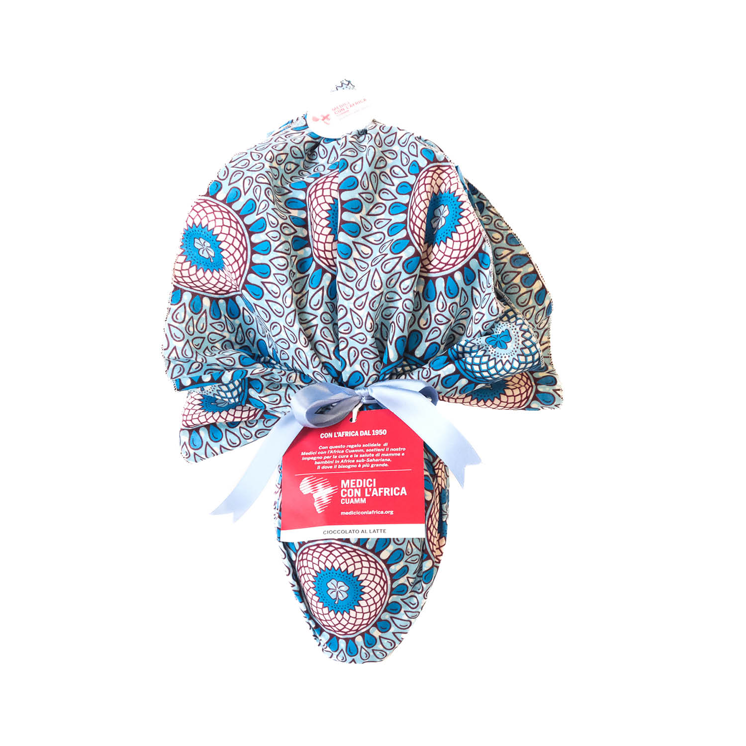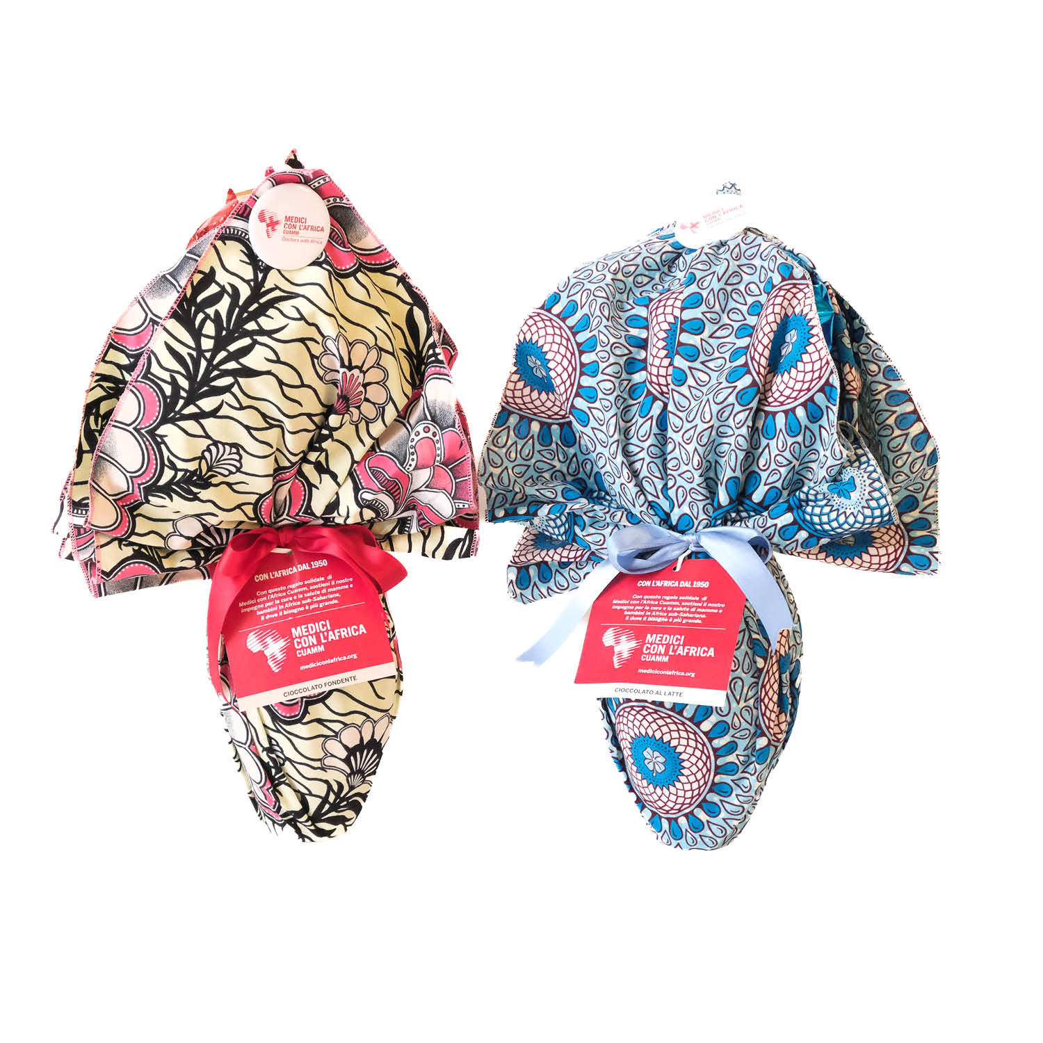 Confezionamento con tessuto wax africano, spilla con logo Cuamm e cartiglio.