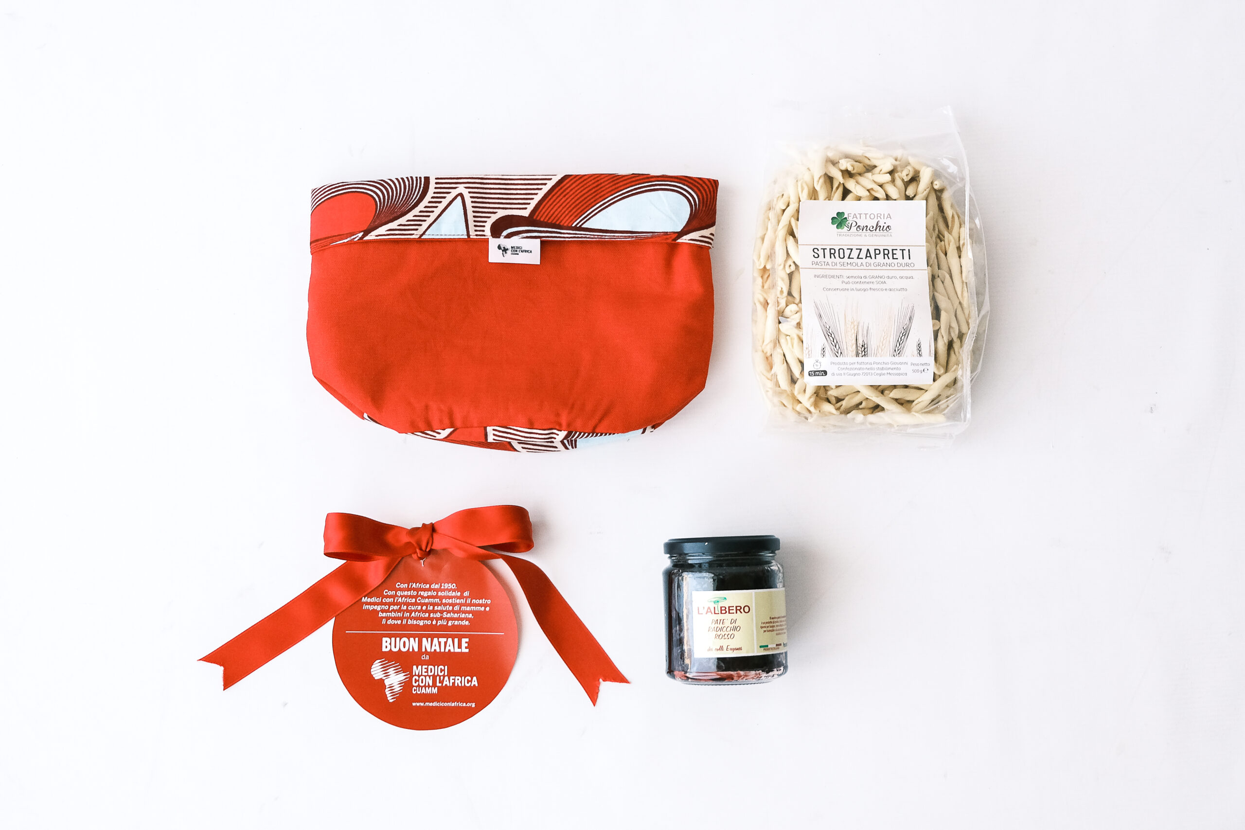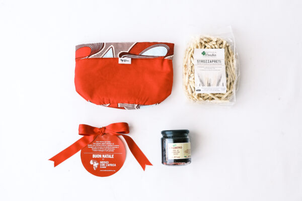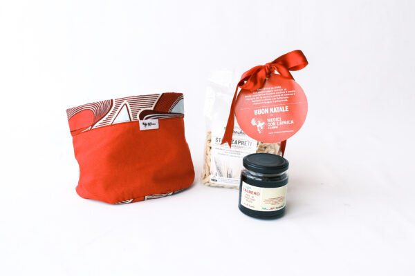 Il cestino portapane nella versione salata è composto da: un patè di radicchio, una confezione di pasta “foglie d’ulivo” e un biglietto d’auguri di Medici con l’Africa Cuamm.